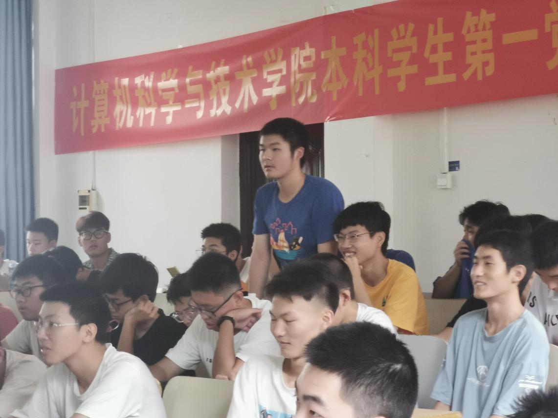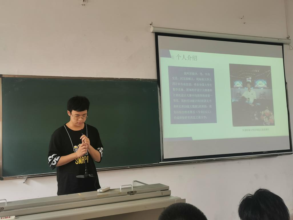 会议共有三项议程。会议第一项,优秀学长学姐分享经验及现场答疑。首先由2018级计算机科学与技术2班常傲洋同学分享经验。常傲洋同学条理清晰地从学习、竞赛和生活三方面分享了他个人的心得体会。他指出在大学阶段,需要尽早地对自己的未来有一个清晰明确的定位,在课外也要多去学习计算机相关知识,我们需要花大量的时间去学习新知识,零碎的时间用来背单词和娱乐,要尽自己所能利用好学校的资源。同时应该热爱、珍惜大学四年时光,并坚持锻炼身体。他总结到,就读计算机专业,如同身处逆流,不进则退,要尽自己所能无时不刻不断扩充自己的知识,这样才不会被时代抛弃。