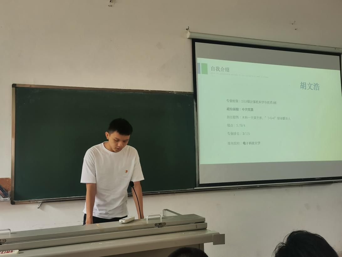 随后由2018级计算机科学与技术4班胡文浩同学分享经验。胡文浩同学分享了自己大一至大三三个阶段以及保研的学习经历和心路历程。他指出,在大一大二时间比较充裕的阶段,除好好学习夯实基础外,也应多去尝试一些新事物,发掘自己的兴趣爱好,提升自己的能力。同时作为计算机专业的学子,也应早早开始培养自己的动手编程能力。在大二大三可以规划自己未来的方向,无论是考研、考公、找工作还是选择出国,都需要尽早做准备。