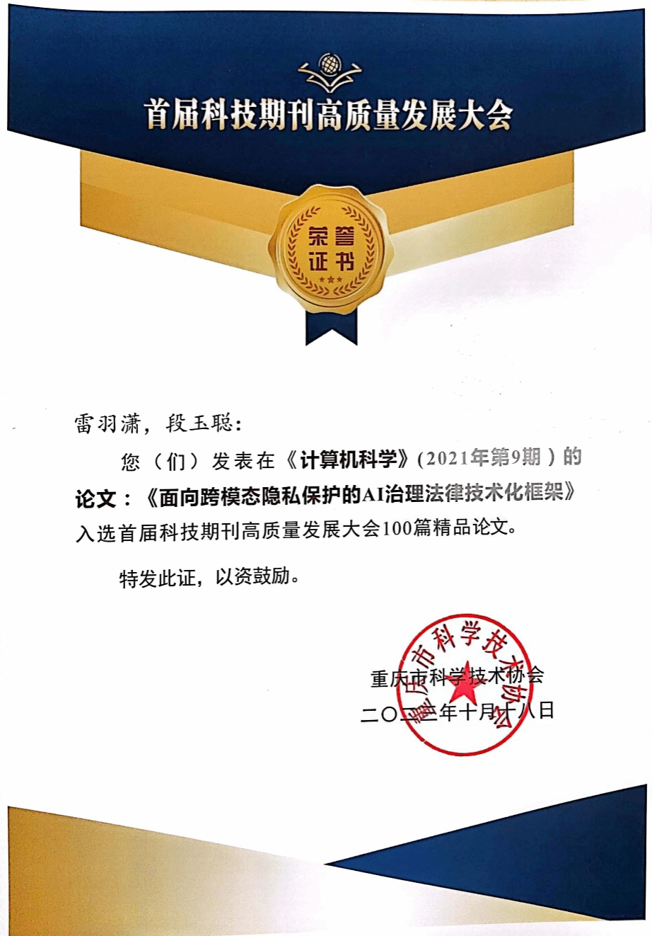 本站讯(记者 柏东鹏 唐福亮)海南大学william威廉英国官网段玉聪教授团队DIKWP实验室发表论文《面向跨模态隐私保护的AI治理法律技术化框架》,荣获“科技期刊高质量发展大会100篇精品论文”。
