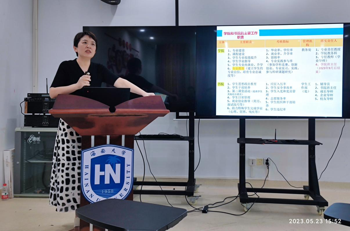 红英还讲解了学院与书院的主要工作职责,明确了学业导师的主要工作内容,指导学业导师开展学业指导工作,就如何提高学生毕业率和升学率、就业率,如何减少延长修业年限学生的比例,如何提高学生参与学科竞赛、参与专业实习实践,提高就业能力等方面,以及如何处理特殊问题的学生等提出了自己的指导意见。