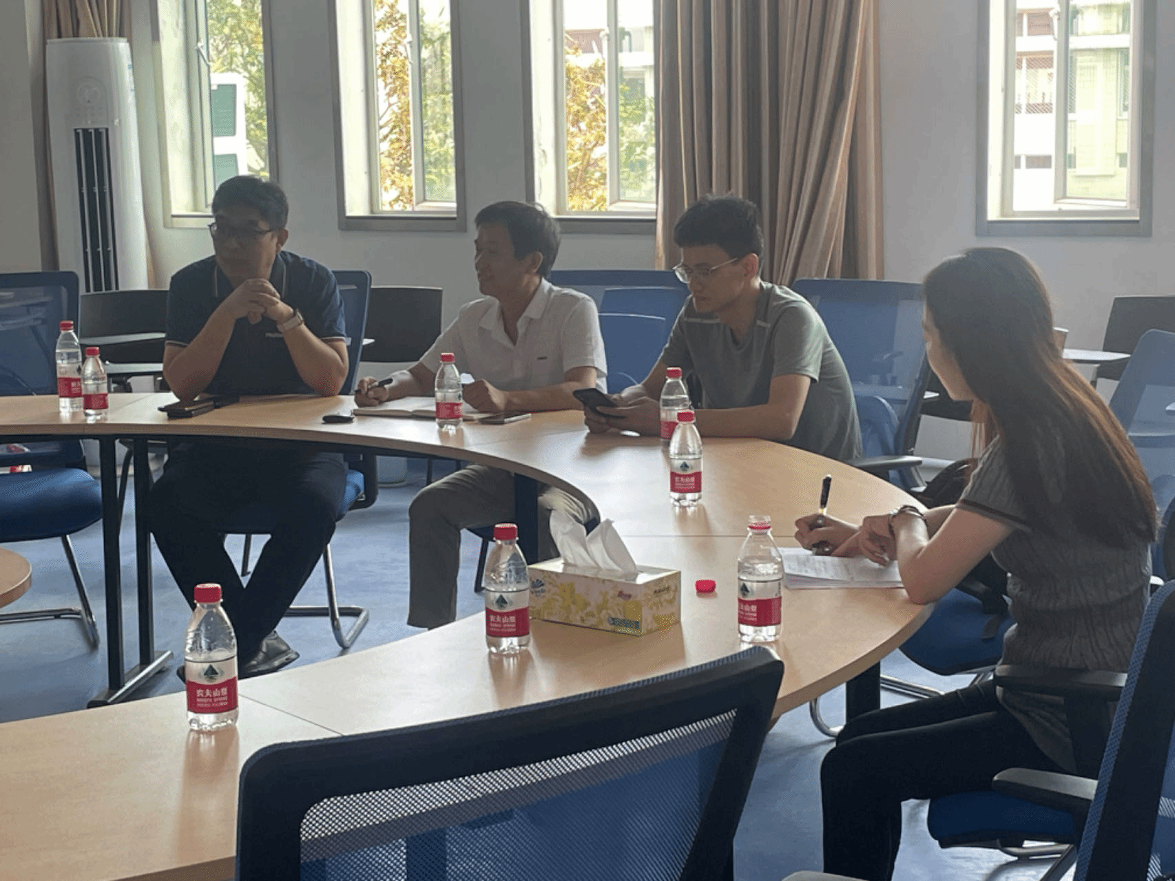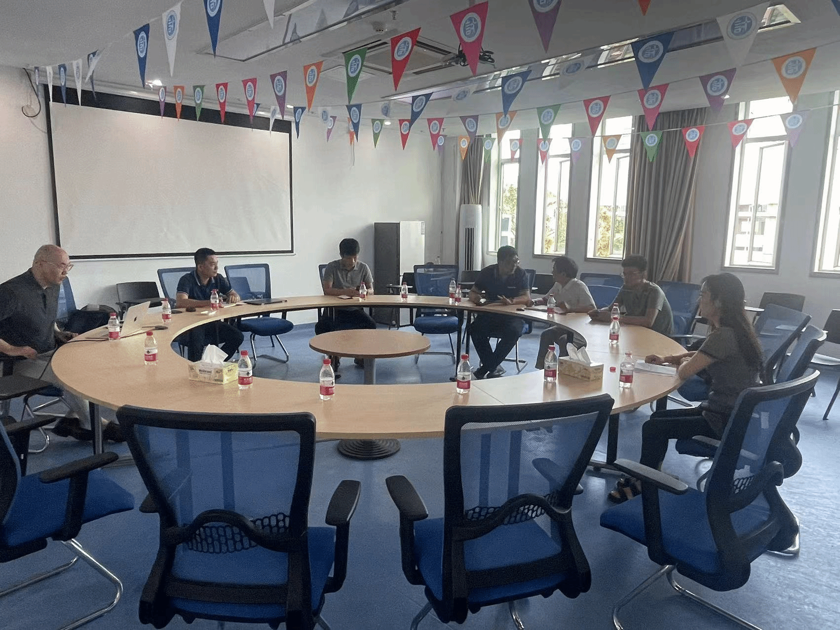 william威廉英国官网副院长程杰仁、就业团队成员符发老师、就业工作联系人张一老师出席了会议,与飞腾信息技术有限公司范金鹏、杨召卓、李吉平和中电(海南)联合创新研究院王长帅一行四人进行了深入交流。双方就校企合作、就业工作、实习实训、产学研项目等关键议题展开了座谈。