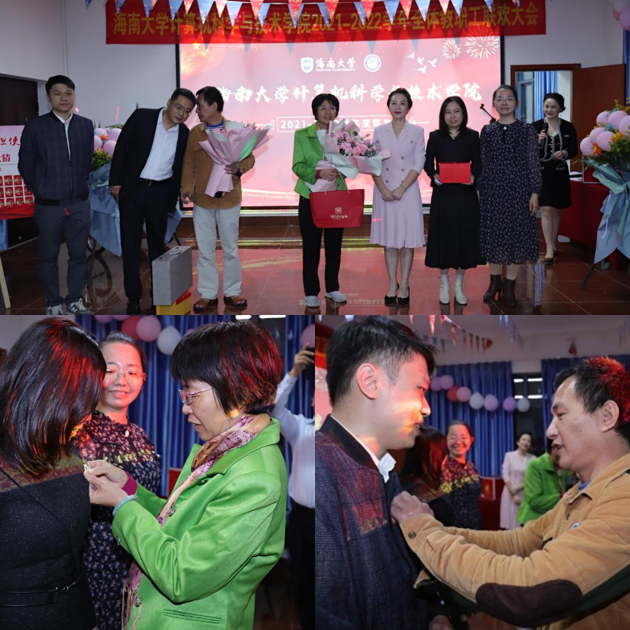 联欢大会还举行了一个特别的荣退迎新仪式,随着聚光灯暗下,大屏幕上放映出学院工会为2022年即将退休的陈文贤、詹尊策两位老师拍摄的荣退视频——海大的美景......办公室的工位......同事们饱含深情的祝福......一帧帧画面,都定格在这个美好的夜晚。即使光荣地退休,离开工作的岗位,计算机学院也永远是他们温暖的家!在一片掌声中,杨天若和王红英代表学院向他们赠送了退休纪念品,学院新引进和调入的四位新老师冯浩、沈笑、李华和郑虹则向两位退休老师敬献了鲜花,并由退休老师亲手为新人们佩戴上了计算机学院的院徽。在场的教职工都深深的被这场仪式打动了,因为这代表着计算机学院一种生生不息的传承。