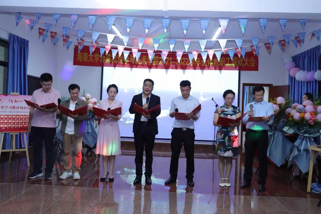 紧接着,学院领导班子集体亮相,在杨天若院长、王红英书记的带领下,学院新一届年轻而朝气蓬勃的班子成员用坚定而洪亮的声音,朗诵了一首《自贸港里的闯海人》。“生逢其时,重任在肩,海南自由贸易港,既是我们拥有的发展空间,也是我们承载的伟大使命......我们都将是海南自贸港的见证者、开创者、建设者!”这既像是宣言,表达着计算机学院每一位教职工乐观向上的态度;也像是号角,集结着计算机学院每一位教职工奋勇向前的力量!