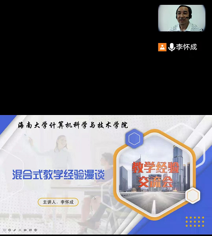 4.《混合式教学经验漫谈》,李怀成主讲。会上,李怀成老师谈论了混合式教学监管过程,分享网络精品课程建设经验。提到了学院为视频课件录制工作配置专门录制教室。分享了视频课件录制经验、实验与课程设计经验、线上课堂教学经验,课堂教学活动方式,平时分管理经验,课程考核经验等。