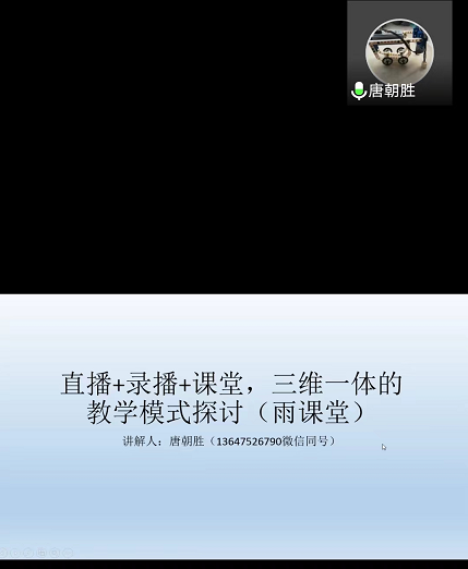 1.《直播+录播+课堂,三维一体的教学模式探讨(雨课堂)》,唐朝胜主讲。会上,唐朝胜老师分享了长江雨课堂操作经验、注意事项、教学经验,并现场演示教师与学生互动环节。