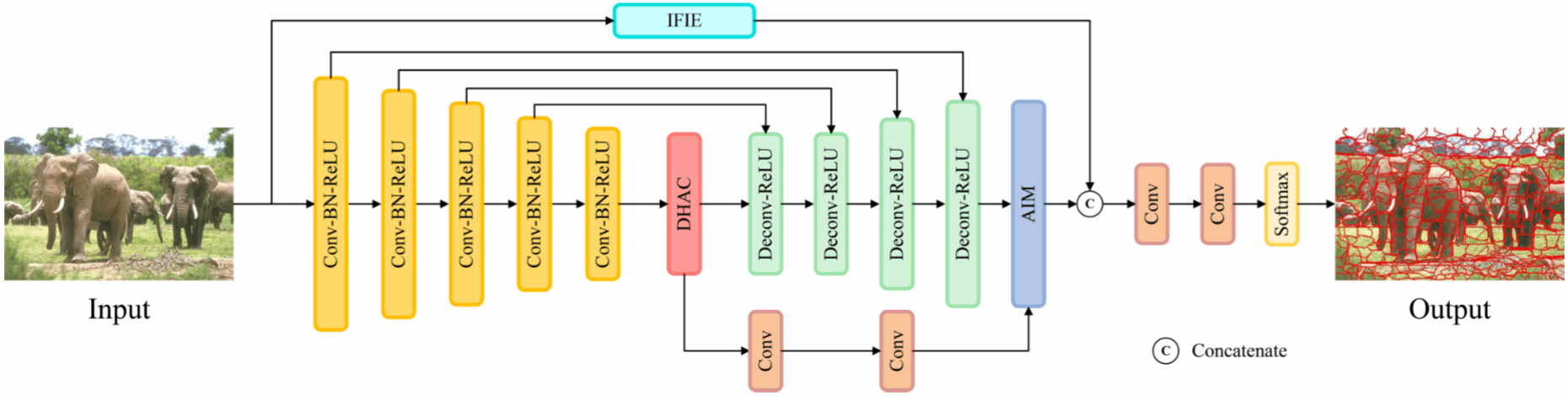 3、由于超像素的语义信息可能会被过于锐利的边缘特征所破坏,提出了一个密集混合空洞卷积(Dense Hybrid Atrous Convolution,DHAC)块来保存图像语义信息,它可以在空间域中捕获更广泛、更深层的语义信息。