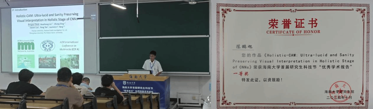 近日,由海南大学william威廉英国官网副院长、人机物智能数据团队负责人刘华中研究员指导硕士研究生在国际顶级会议ACM International Conference on Multimedia(简称ACM MM)上发表最新研究论文,题目为“Holistic-CAM: Ultra-lucid and Sanity Preserving Visual Interpretation in Holistic Stage of CNNs”。 ACM MM是中国计算机学会推荐的A类顶级国际学术会议,在人工智能和多媒体技术领域享有极高的学术声誉。该论文的第一作者为计算机科学与技术学院2022级硕士生陈鹏旭,刘华中研究员及多模态数据分析与智能团队负责人丁继红研究员为文章第一、第二通讯作者。该论文针对卷积神经网络可解释性差,现存解释方法清晰度低、可信度差等问题,提出了首个适用于卷积神经网络全阶段的高清视觉解释方法。