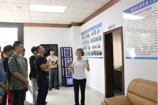 海口市美兰区海甸街道办事处综治办副主任、禁毒办副主任符良玲向同学们介绍禁毒宣传工作。符良玲主任多年来一直坚持“以情感化,用心帮扶,让浪子回头”的工作方式,在她的带领下,辖区戒毒帮教对象列管率达100%,帮教率达100%,赢得了辖区内外无数居民的尊重。因此,符良玲荣获“全国社会治安综合治理先进个人”荣誉称号。2017年6月,符良玲被中国文明网评为“中国好人”,以及符良玲荣获“中国网事·感动2017”年度十大人物,这也是海南省唯一一位入选人物。