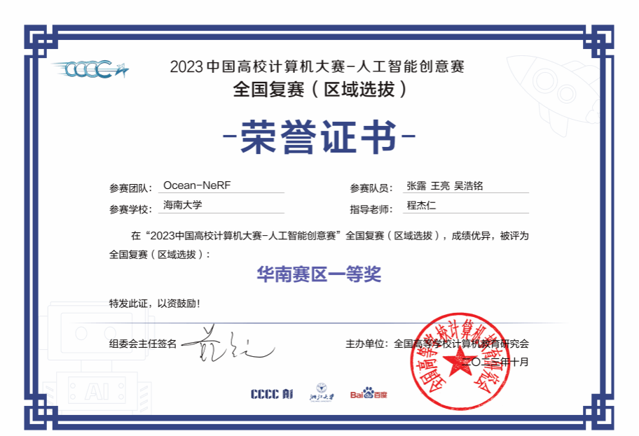 近日,2023年(第六届)“中国高校计算机大赛-人工智能创意赛”复赛圆满结束,决赛名单揭晓。我院学生团队作品“基于神经辐射场三维重建技术的三维数字海洋旅游纪念品生成平台 ”荣获了华南赛区一等奖,成功晋级决赛。该作品由程杰仁教授指导,张露、王亮、吴浩铭三位同学共同完成。