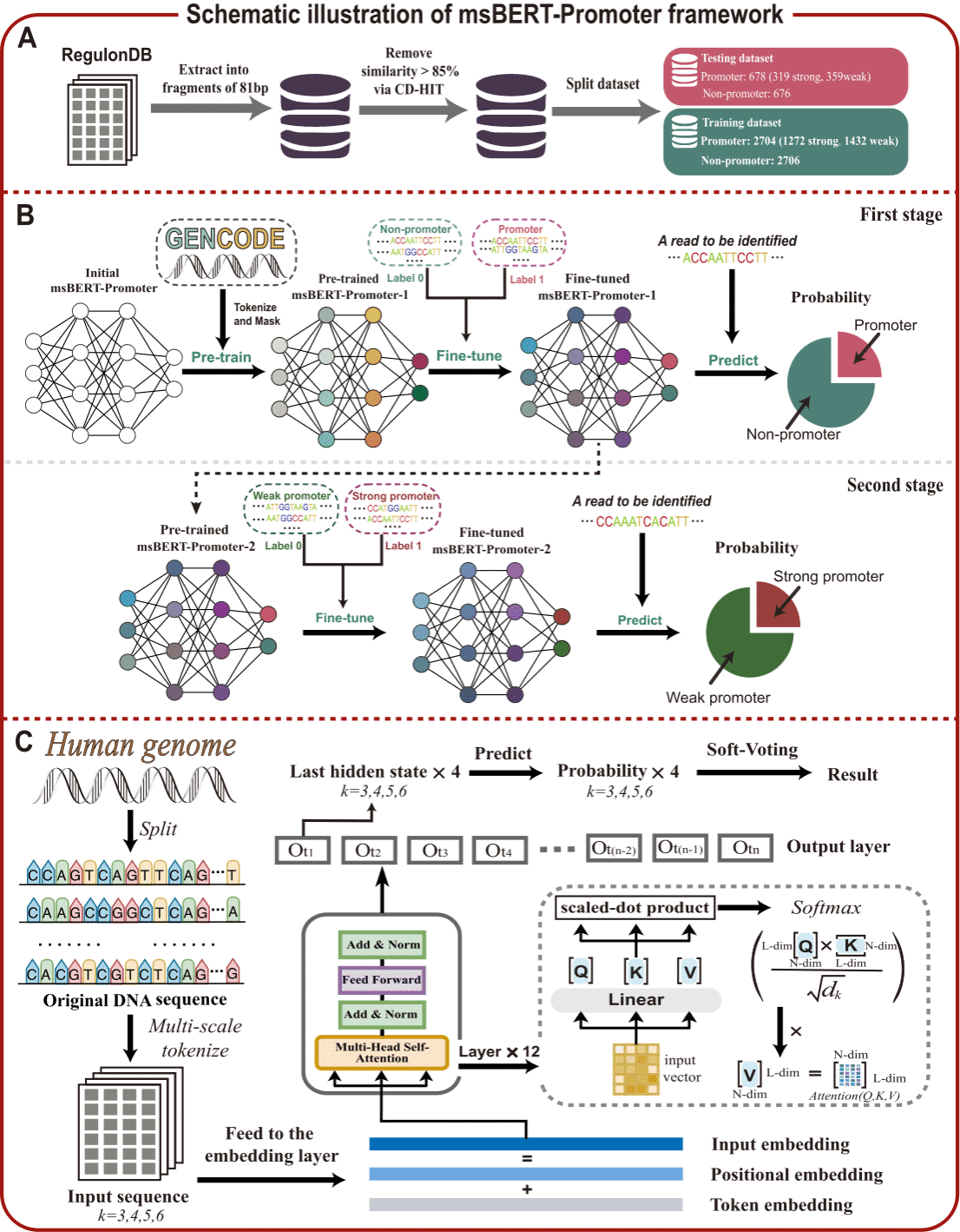 据悉,在学校学科交叉的背景下,该团队结合学科优势、从专业兴趣出发创建了BioAi -Lab课题组,该论文更是以计算机、数学、生物的学科交叉方式提出了一种新的计算模型msBERT-Promoter用于启动子及其强度预测。该模型利用预训练大模型DNABERT提取多尺度序列特征,并采用软投票集成策略融合不同集学习器,通过两阶段微调来促进模型对更深层次序列信息的理解,最终在启动子识别和启动子强度预测两项任务中均取得了最先进的性能,并通过注意力分析和t-SNE降维等来增强模型的可解释性。